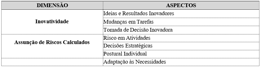 No que commpete a essas dimensões centrais que evidenciam se a organização adota o intraempreendedorismo como fundamento do trabalho de seus membros, são: inovatividade, assunção de riscos calculados, liderança, proatividade e comprometimento. Importante dizer que cada uma das dimensões que definem o comportamento intraempreendedor de membros da organização são constituídos por determinados aspectos que lhes são comuns.