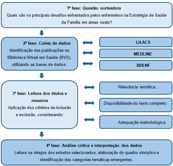 A Figura 1 esquematiza o percurso metodológico executado para a condução desta revisão integrativa, organizado em quatro fases sequenciais. Na primeira fase, procedeu-se à formulação da questão norteadora, fundamentada na estratégia PICo, que direcionou integralmente o processo de busca e seleção da literatura.