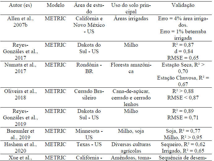 Estudos demonstraram bons resultados na utilização do modelo METRIC para estimar e mapear a evapotranspiração em diferente uso do solo (Numata et al., 2017; Nema et al., 2020), utilizando imagens do satélite Landsat (Sena et al., 2025), do sensor MODIS (Javadian et al., 2019) e do sentinel (Guzinski et al., 2020). Além de apresentar boa correlação com a evapotranspiração determinada por lisímetro de pesagem (Allen et al., 2007b; Hashem et al., 2020), razão de Bowen (Carrasco-Benavides et al., 2014) e atmômetro (Reyes-González et al., 2017).