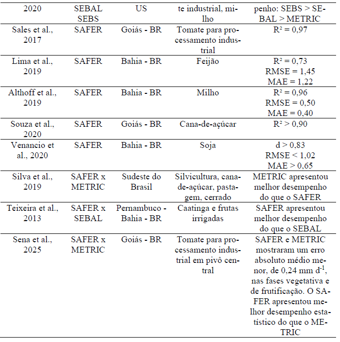 Na Tabela 1 estão as aplicações abreviadas dos modelos METRIC e SAFER utilizando imagens do satélite Landsat.