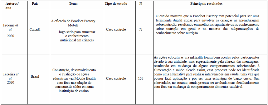 Com a pesquisa bibliográfica nas bases de dados selecionadas neste estudo, pode-se constatar que a quantidade de artigos relacionadas a aplicativos desenvolvidos para a nutrição ainda é baixo, mesmo que esta tendência seja a de se erguer com o avanço da tecnologia e o aumento da dependência do homem moderno ao uso de softwares e tecnologia. Foi possível observar que o desenvolvimento de aplicativos relacionados a esse tema pode influenciar de maneira eficiente a escolha de uma alimentação saudável em públicos gerais ou específicos.