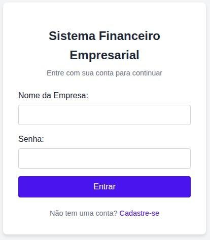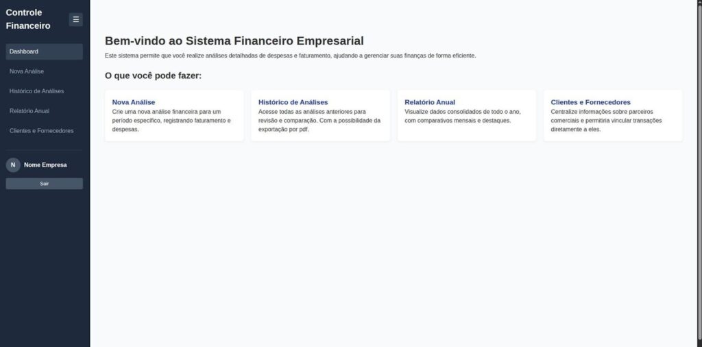 Durante o desenvolvimento do sistema, foram implementadas diferentes telas funcionais com o objetivo de garantir uma navegação intuitiva, segmentação de informações e controle eficiente dos dados financeiros da empresa.