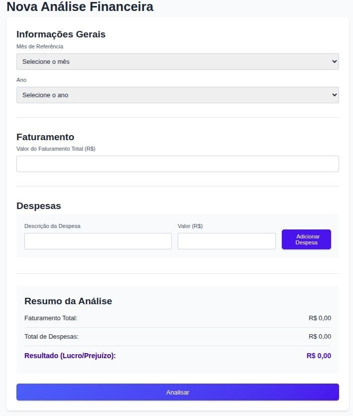 A funcionalidade “Nova Análise” permite que o usuário crie uma análise financeira específica para um determinado mês e ano. Nessa interface, o usuário informa o valor do faturamento mensal e insere as despesas individualmente, com descrição e o valor correspondente. (Figura 4).