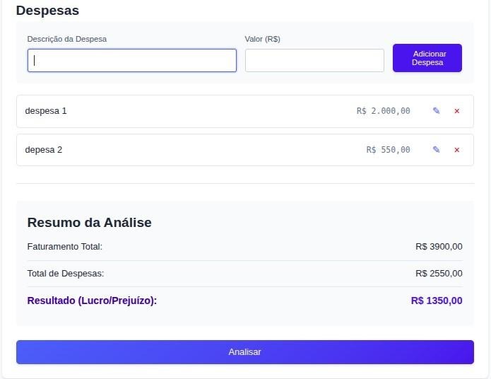 A cada nova despesa adicionada, podendo ela ser editada ou excluída, o sistema atualiza automaticamente o resumo da análise, exibindo o total do faturamento, o somatório das despesas e o resultado final, que pode representar lucro ou prejuízo.