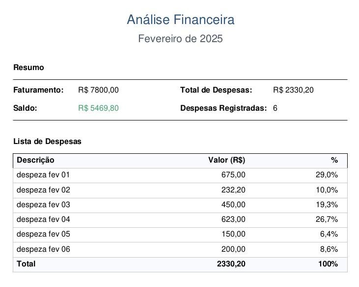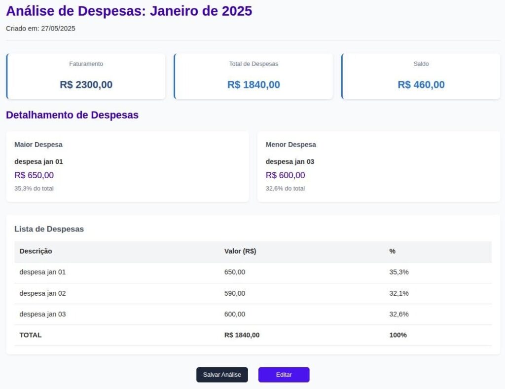 Após o preenchimento, o sistema gera uma visualização detalhada dos dados financeiros. Ela destaca automaticamente a maior e a menor despesa, mostrando valores e percentuais. Abaixo, uma tabela lista todas as despesas com suas proporções, facilitando a análise dos principais custos. A interface também oferece opções para salvar ou editar, tornando o processo mais flexível. (Figura 7).