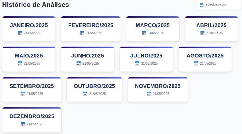 O histórico permite ao usuário visualizar todas as análises financeiras salvas, organizadas por mês e ano. Cada análise é exibida em um botão individual com o nome do mês/ano no topo, abaixo o dia exato em que a análise foi realizada, o que contribui para um registro mais preciso e facilita o acompanhamento cronológico das atividades financeiras. (Figura 8).
