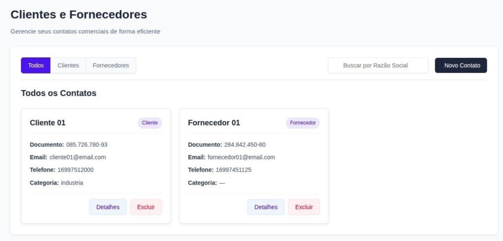 A interface apresenta um cabeçalho com título e descrição, barra de ferramentas com filtros “cliente, fornecedor ou todos” e busca por razão social. Os contatos são exibidos em cards, com acesso rápido às ações e informações principais. (Figura 14).