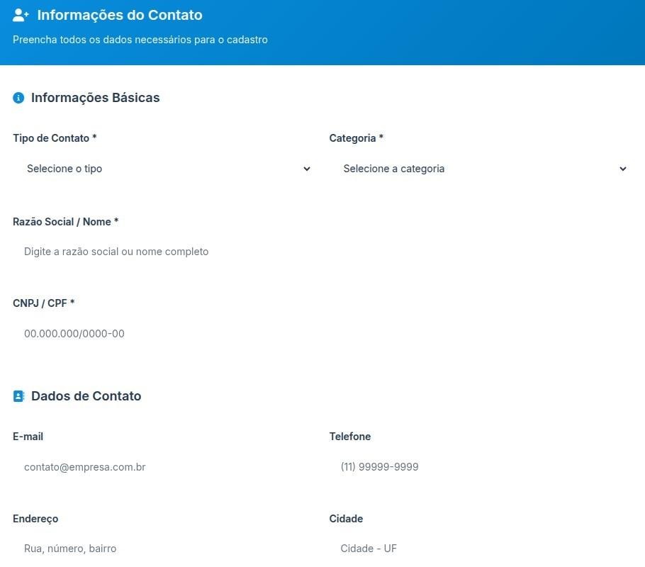 O formulário de cadastro inclui campos básicos como tipo cliente ou fornecedor, razão social, CPF/CNPJ, categoria (varejo, atacado, indústria, serviço ou outro) e dados de contato (e-mail, telefone e endereço). (Figura 15).