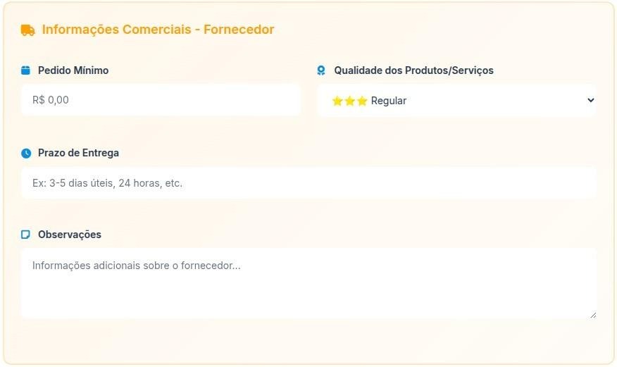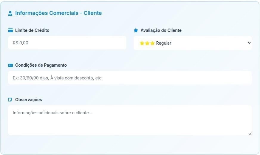 Para clientes, há campos adicionais como limite de crédito, condições de pagamento e avaliação. Para fornecedores, inclui pedido mínimo, tempo de entrega e avaliação de qualidade. Um campo de observações para ambos que permite registrar anotações extras.