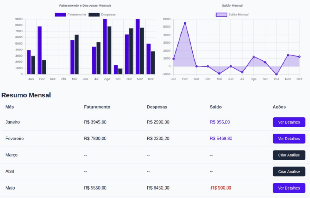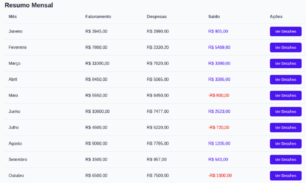 Abaixo do relatório, possui o Resumo Mensal, apresentado em formato de tabela. Cada linha representa um mês do ano selecionado, com colunas que mostram o faturamento, total de despesas e o saldo do período. Os saldos positivos são destacados em azul, enquanto os negativos aparecem em vermelho para facilitar a identificação visual. Na última coluna, há um botão “Ver Detalhes”, ao clicar, direciona o usuário diretamente para a tela de análise detalhada daquele mês. (Figura 12).
