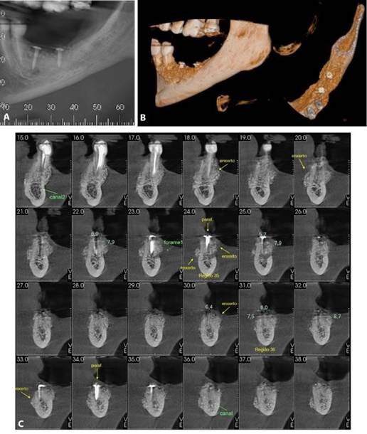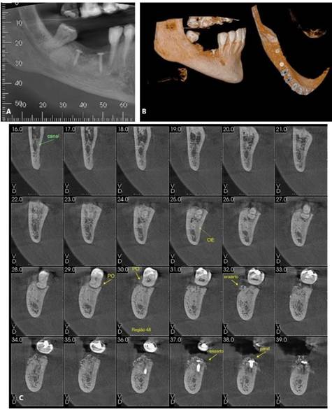 Figura 05. Exames de imagem da região inferior direita. A) Vista panorâmica. B) Reconstruções tridimensionais. C) Cortes transversais oblíquos.