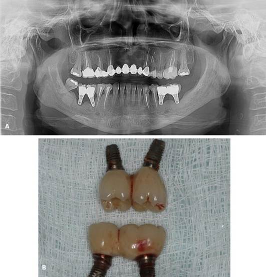 Figura 04. A) Radiografia panorâmica inicial. B) Implantes dentários removidos – região do 36, 37, 46 e 47.