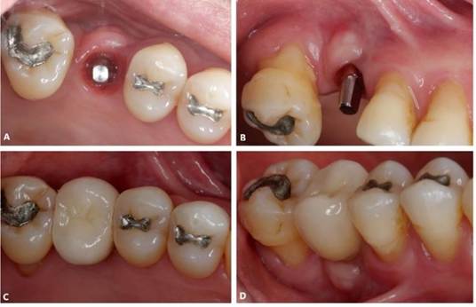 Figura 02. A, B) Etapa operatória da instalação do implante dental curto. C, D) Tratamento finalizado. Aspecto final com a reabilitação protética-implante.