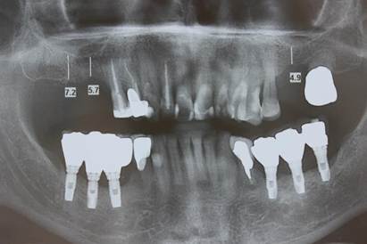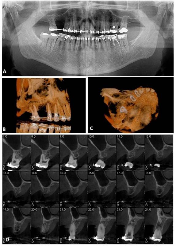 Paciente A. R. S, gênero feminino, 67 anos de idade, compareceu ao consultório particular, em 2020, com a queixa de mobilidade na região dos implantes inferiores. Na anamnese, paciente realizava acompanhamento médico devido ao quadro de diabetes mellitus, com uso de medicamentos específicos. Ao exame clínico, verificado mobilidade acentuada na regão do 36, 37, 46 e 47. Foram solicitados radiografia panorâmica (Figura 04. A) e tomografia computadorizada da área, evidenciando comprometimento periodontal avançado nas reabilitações com implantes dentários. O plano de tratamento proposto foi a remoção dos implantes e nova reabilitação da região atrófica.