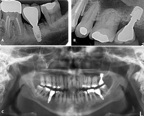 O tratamento consistiu pela exodontia do 27, instalação de implantes extracurtos ARCSYS (FGM, Joinvile – SC, Brasil) 4,3 x 5,0mm na região do 26, e implantes extracurtos ARCSYS (FGM, Joinvile – SC, Brasil) 5,0 mm x 5,0 mm no 27. A reabilitação protética foi realizada através de próteses unitárias de cerâmica. O acompanhamento está sendo realizado até o presente momento, sem alterações significativas, com resultado clínico e radiográfico satisfatório (Figura 9. A – C).