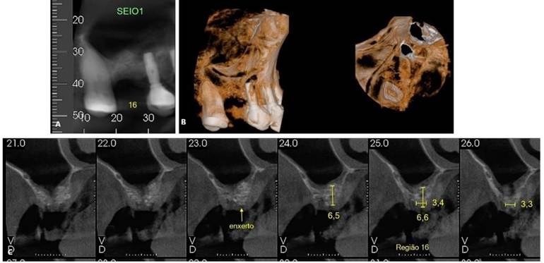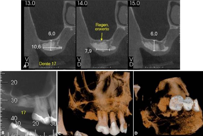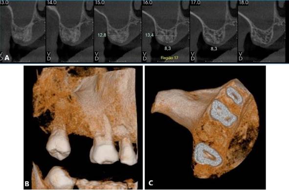Paciente S. M. T, gênero masculino, 62 anos de idade, compareceu ao consultório particular queixando-se de sintomatologia dolorosa na região do 27. O paciente relatou presenta de insuficiência renal crônica, em tratamento através da hemodiálise. Ao exame clínico e radiográfico, foi proposto a exodontia dos elementos dentários 17 e 27, devido a perda óssea periodontal significativa, inviabilizando a sua manutenção. No mesmo tempo cirúrgico da exodontia, foi realizado a preservação alveolar com enxerto (Bio-Oss, Geistlinch, Wolhusen – Suíça) e membrana (Bio-Gide, Geistlinch, Wolhusen – Suíça). As figuras 15 (A – C) e 16 (A – C) ilustram a TCFC após a extração. Posteriormente, foram instalados implantes curtos ARCSYS (FGM, Joinvile – SC, Brasil) 3,8 mm x 7,0 mm na região do 17, e 4,3 mm x 5,0 mmARCSYS (FGM, Joinvile – SC, Brasil) no 27. O acompanhamento clínico e radiográfico realizado durante 04 anos, com resultados satisfatórios.