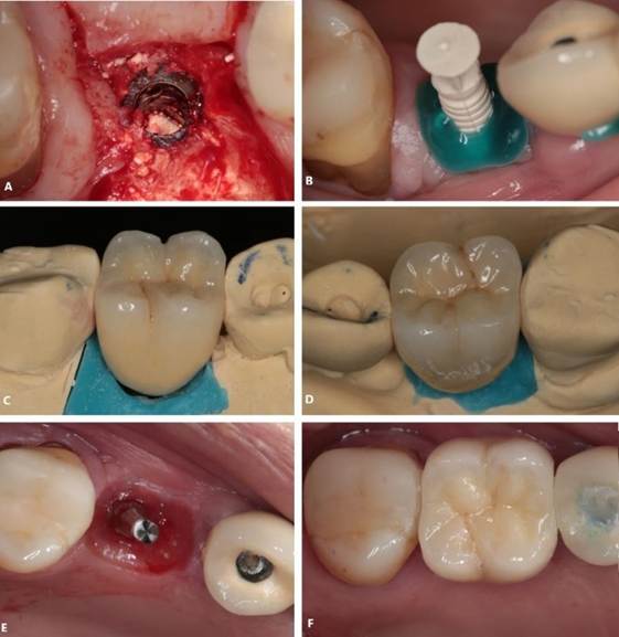 Figura 13. A – F) Sequência operatória da reabilitação com implantes e protética.