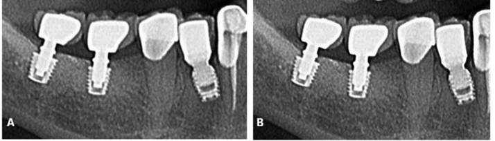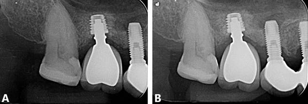Posteriormente, paciente foi reabilitado com prótese unitária sobre implantes (Figura 02. C,D) e o acompanhamento clínico e radiográfico (Figura 03. A, B) está sendo realizado até o presente momento, evidenciado resultado estável.