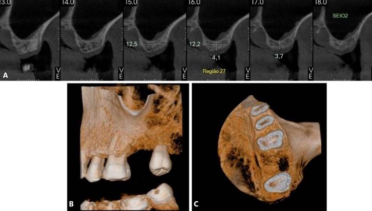 Figura 12. A – C. Tomografia computadorixada de feixe curto (TCFC) evidenciada região edêntula do 16, após 4 meses da exodontia.
