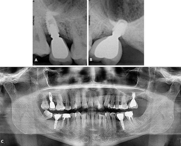Figura 17. A, B) Radiografia periapical final. C) Radiografia panorâmica final.