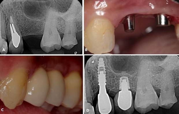 Figura 18. A) Radiografia periapical inicial. B) Condição clínica após a realização dos implantes. C) Reabilitação protética. D) Radiografia periapical final.