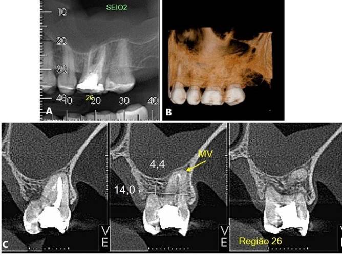 Figura 19. A – C) TCFC da região do 26, evidenciando fratura.