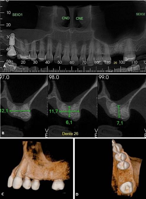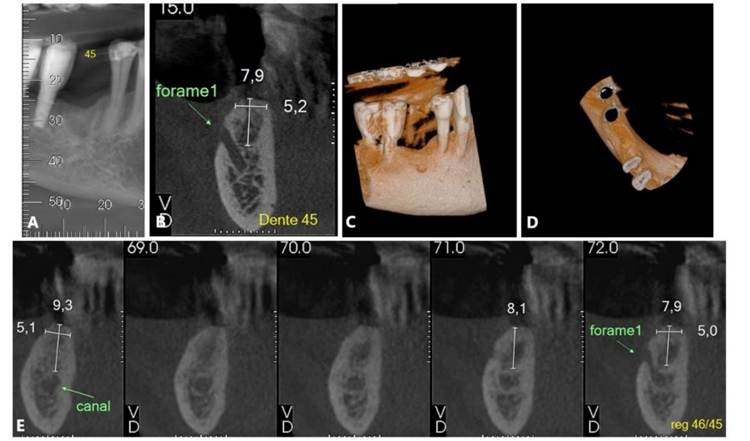 Foram solicitados exames complementares, incluindo radiografia panorâmica e tomografia computadorizada, para avaliação precisa da região anatômica, permitindo a quantificação da espessura e altura óssea (Figura 01. A-D). O plano de tratamento consistiu pela instalação de implantes ultrashort ARCSYS (FGM, Joinvile – SC, Brasil) 4,3 mm x 5,0 mm.