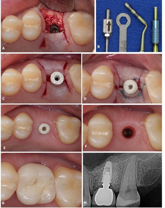 Figura 22. A – F) Sequência operatória. G) Reabilitação protética. H) Radiografia periapical final.