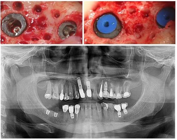 Figura 24. A, B) Sequência operatória. C) Radiografia panorâmica após a reabilitação com implantes.