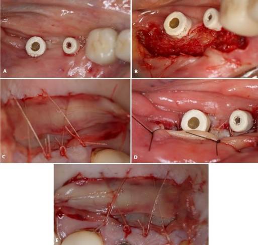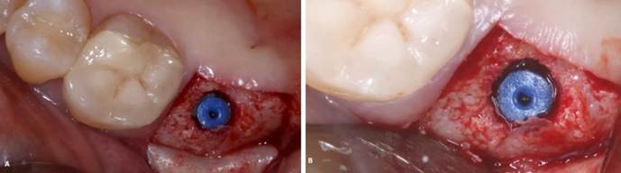 Figura 20. A, B) Utilizado enxerto Cerabone (Straumann, Villeret, Suíça) e membrada de politetrafluoroetileno (PTFE).