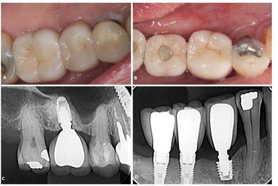 Paciente P. W. L, sexo masculino, 58 anos de idade, compareceu ao consultório particular para avaliação rotineira. O paciente relatou ausência de histórico de alterações sistêmicas e de alergias. Ao exame clínico e radiográfico, evidenciado comprometimento nos elementos 16 e 44. O tratamento consistiu inicialmente pela exodontia de ambos, preservação alveolar utilizando enxerto Cerabone (Straumann, Villeret, Suíça) e membrada de politetrafluoroetileno (PTFE). Após um período de 21 dias, a membrana foi removida. As figuras 26 (A -D), 27 (A – D) evidenciam o aspecto após as exodontias. Posteriormente, segui-se pela instalação de implante curto ARCSYS (FGM, Joinvile – SC, Brasil) 3,8mm x 7,0 mm na região do 16 e ARCSYS (FGM, Joinvile – SC, Brasil) 4,3 mm x 5,0 mm no 44. A reabilitação protética foi realizada através de próteses unitárias de cerâmica. O acompanhamento está sendo realizado até o presente momento, sem alterações significativas, com resultado clínico e radiográfico satisfatório (Figura 28. A – D).