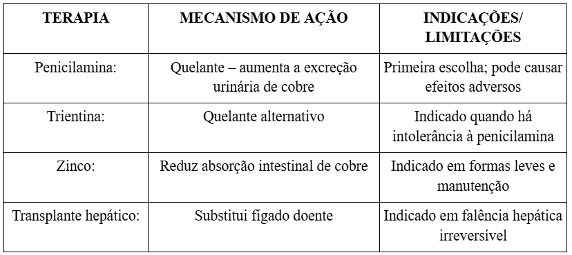 Em relação ao tratamento, os resultados analisados destacam a importância do início precoce da terapia quelante para prevenir complicações irreversíveis. O uso de penicilamina, trientina e zinco se mostrou eficaz em controlar a sobrecarga de cobre quando instituído antes do surgimento de cirrose ou alterações neurológicas graves (PFEIFFER, 2007; FERENCI et al., 2019; SAMPAIO et al., 2023). Entretanto, nos casos em que o diagnóstico é tardio, o dano hepático é frequentemente irreversível, tornando o transplante hepático a única chance de uma sobrevida.