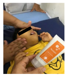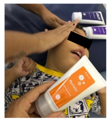 As crianças passaram a fazer uso de 03 géis frequenciais com tecnologia Quantum Health®, sendo eles: Mentalis®, Calmallis® e Oxyflower® (Fisioquantic S/A, Maringá – PR, Brasil). Estes foram utilizados por cerca de 06 meses e as mães foram orientadas a usá-los diariamente sobre a pele das crianças duas vezes ao dia, de manhã e à noite. Todos os géis foram utilizados em sequência, sobre a região peitoral (Oxyflower®), região abdominal (Calmallis®) e face (Mentalis®). O tempo de aplicação foi 40 segundos, mantendo-se o contato das mãos sobre a pele das crianças durante o tempo da massagem (Figuras 01 e 02).