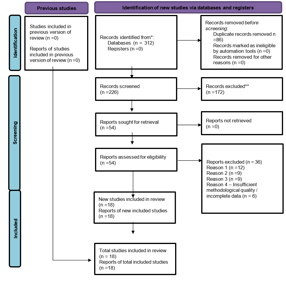 Foram inicialmente identificados registros em bases eletrônicas e por busca manual. Após a remoção de duplicatas e triagem, 18 estudos foram incluídos na síntese final, combinando pesquisas originais apresentadas no projeto e estudos adicionais da atualização bibliográfica.