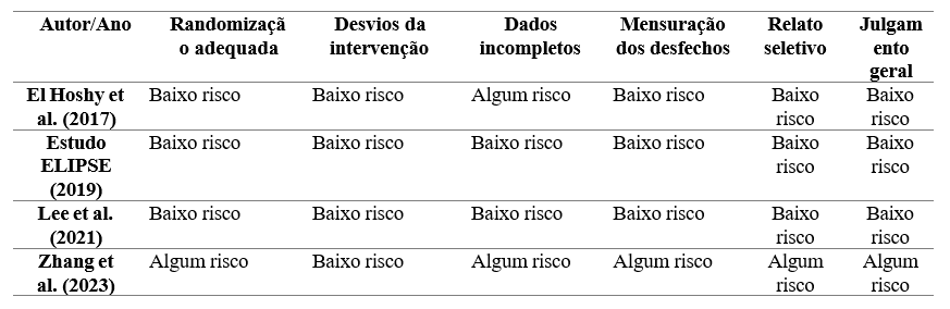 Os ensaios clínicos randomizados foram avaliados pela ferramenta RoB2 da Cochrane, enquanto estudos não randomizados foram submetidos à avaliação pelo instrumento ROBINS- I ou ferramentas equivalentes. Devido à heterogeneidade metodológica dos estudos incluídos, a síntese dos resultados foi realizada de forma narrativa.