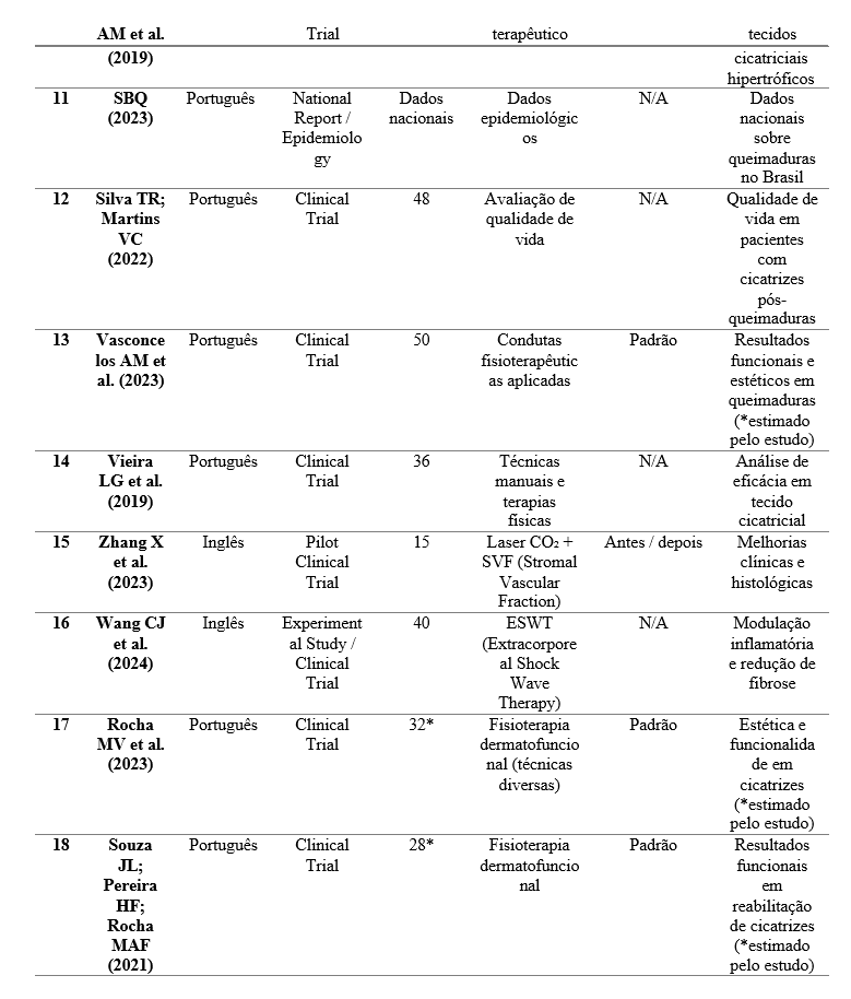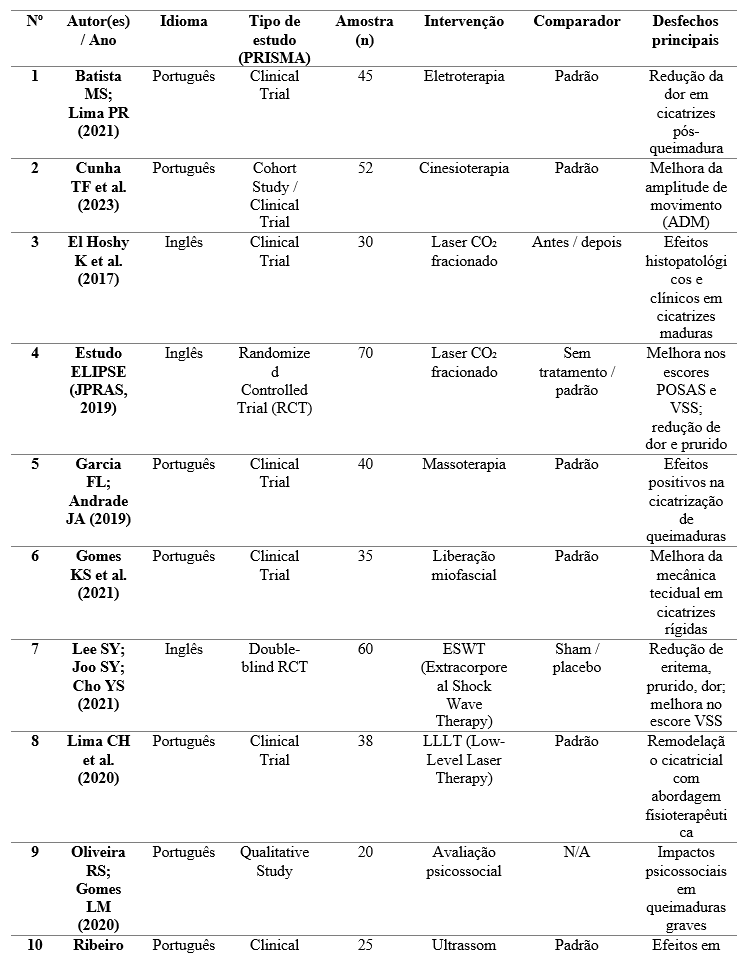 Foram incluídos ensaios clínicos randomizados, estudos controlados, coortes prospectivas, séries de casos e relatos de caso com dados quantitativos. Participaram pacientes com cicatrizes hipertróficas secundárias a queimaduras. As intervenções avaliadas abrangeram técnicas de fisioterapia dermatofuncional, como terapia por ondas de choque focais (ESWT), laser de dióxido de carbono fracionado (laser CO₂), laser de baixa intensidade (LLLT), ultrassom terapêutico, massagem, liberação miofascial, cinesioterapia e uso de bandagens ou órteses. Os desfechos analisados incluíram dor (avaliada pela escala visual analógica – VAS), mobilidade (amplitude de movimento – ADM e medidas funcionais), escores de cicatriz (Vancouver Scar Scale – VSS; Patient and Observer Scar Assessment Scale – POSAS), prurido e qualidade de vida.