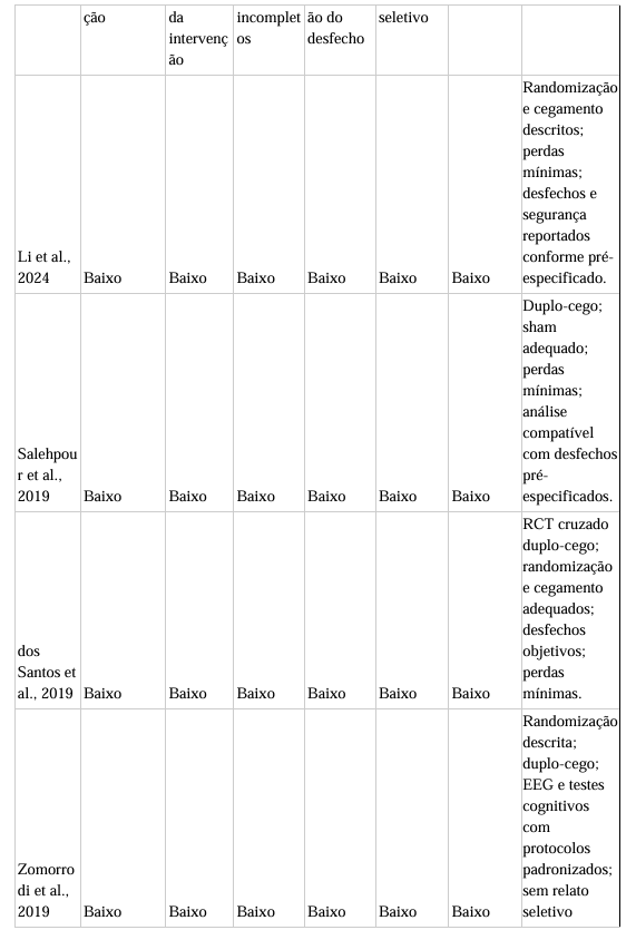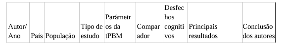Em contrapartida, alguns estudos não identificaram melhora relevante nesses domínios, como Zhang et al., (2022), que não observou alterações significativas em memória verbal apesar de melhora em outros indicadores cognitivos, sugerindo possível variabilidade de resposta relacionada à fase da doença ou à dosimetria empregada.
