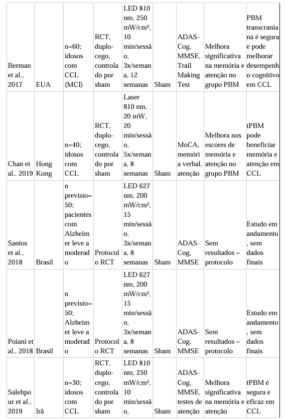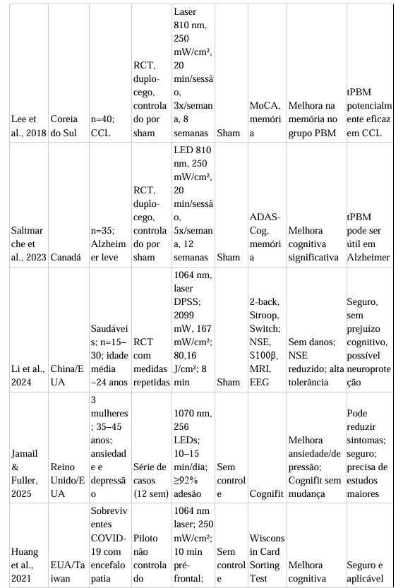 Os resultados desta revisão sistemática indicam que a fotobiomodulação transcraniana (tPBM) apresenta efeitos positivos consistentes sobre a função cognitiva em indivíduos com comprometimento cognitivo leve (CCL) e Doença de Alzheimer (DA) leve a moderada, com predomínio de benefícios nos domínios de memória episódica, atenção e, em alguns casos, função executiva e fluência verbal. Em linhas gerais, a maioria dos estudos demonstrou melhora significativa em pelo menos um domínio cognitivo, especialmente memória e atenção, quando comparado ao grupo sham. Entretanto, os resultados ainda são heterogêneos, influenciados por diferenças nos protocolos de irradiação, características da população e instrumentos de avaliação.