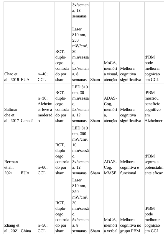 Em síntese, esta revisão demonstra que a tPBM é uma intervenção promissora e segura para a melhora da função cognitiva em CCL e DA leve a moderada, com evidências pré-clínicas que sustentam sua plausibilidade biológica. No entanto, para consolidar seu uso na prática clínica, são necessários ensaios clínicos multicêntricos, com amostras maiores, protocolos padronizados e acompanhamento de longo prazo, a fim de confirmar a eficácia, determinar a dose ótima e estabelecer estratégias de manutenção dos efeitos.