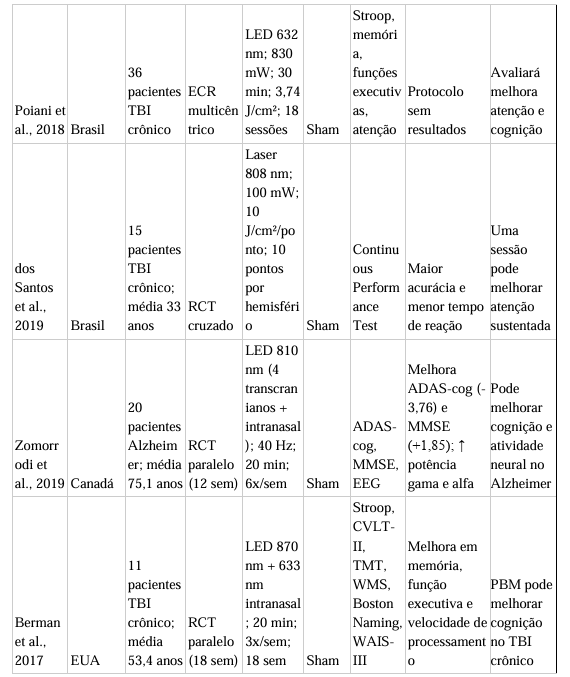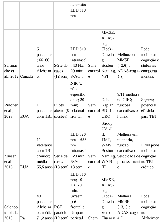 Entretanto, apesar dos resultados promissores, vários estudos apresentaram limitações metodológicas, incluindo tamanhos amostrais reduzidos, ausência de padronização dos parâmetros de irradiação e heterogeneidade nos instrumentos de avaliação cognitiva. Além disso, poucos ensaios realizaram seguimento a longo prazo, o que limita o entendimento da duração dos efeitos da tPBM.