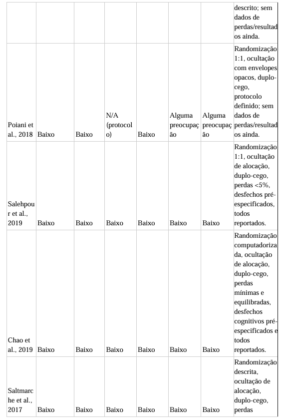 A avaliação da qualidade metodológica foi feita utilizando o Cochrane Risk of Bias 2.0 (RoB 2.0) para ensaios clínicos randomizados, considerando os domínios: processo de randomização, desvios da intervenção, dados de desfecho ausentes, medição dos desfechos e seleção do resultado reportado. Para estudos não randomizados, foi utilizada a ferramenta ROBINS-I (Risk Of Bias In Non-randomized Studies – of Interventions). Os estudos pré-clínicos não foram submetidos a essas ferramentas e foram analisados separadamente como evidências mecanísticas de suporte.