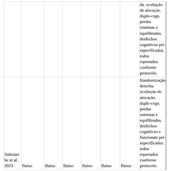 Nos estudos não randomizados em humanos avaliados com ROBINS-I (n=2), o risco global foi moderado, com principais fontes de viés em fatores de confusão (por exemplo, comorbidades e uso de medicações concomitantes), seleção dos participantes e, em menor grau, medição dos desfechos (ausência de cegamento do avaliador). Em ambos, dados ausentes e desvios da intervenção foram classificados como baixo risco.