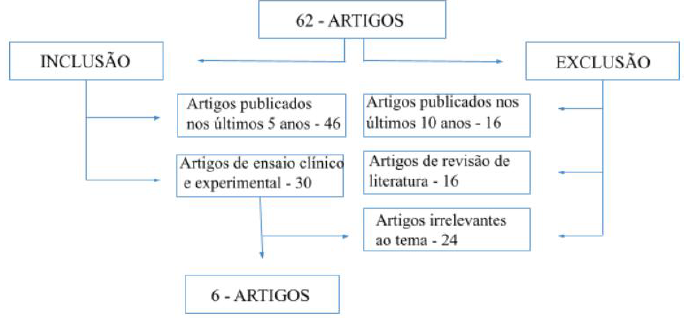 Inicialmente, foi utilizado o método de filtragem de artigos nas bases de dados PEDro, PubMed e SciELO. Foram adotados isoladamente descritores, tipo de estudo e critérios de análise de títulos, ocasionando em 62 artigos. Através da metodologia aplicada e da análise de dados, foram selecionados 46 artigos publicados nos últimos 5 anos, incluindo 30 artigos de ensaio clínico, e ao final, foram selecionados 6 artigos referentes aos padrões de inclusão e realização do presente estudo para a qualificação e coleta de dados. Assim, os resultados do processo de filtragem dos artigos foram sintetizados no fluxograma apresentado a seguir: