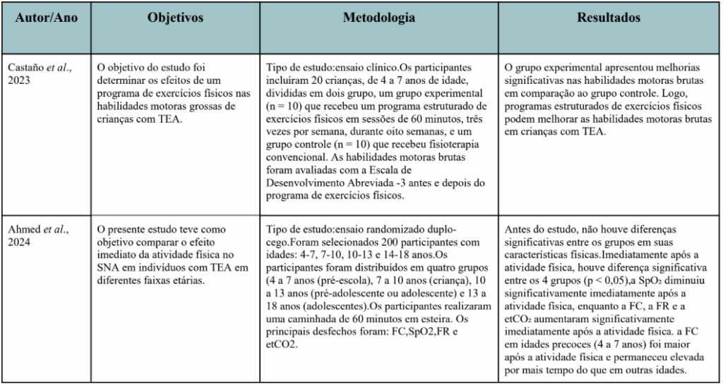 Por outro lado, o estudo de Ahmed et al., (2024) oferece uma perspectiva complementar ao demonstrar que a prática de exercício físico pode exercer efeitos significativos nas respostas fisiológicas de crianças com Transtorno do Espectro Autista (TEA). Esses achados sugerem que a atividade física não apenas promove melhorias no desempenho motor, mas também pode contribuir para o aprimoramento da aptidão física geral. Complementando essa visão, Xing et al., (2024) observaram que a frequência cardíaca(FC) aumentou durante a prática de exercícios estruturados de intensidade moderada. Além Disso, verificaram melhorias nos parâmetros fisiológicos, na força e resistência muscular. Esses achados reforçam a hipótese de que exercícios, especialmente em intensidades mais elevadas, podem desempenhar um papel terapêutico complementar no manejo do transtorno do espectro autista, contribuindo tanto para a reabilitação quanto para a modulação das respostas fisiológicas.