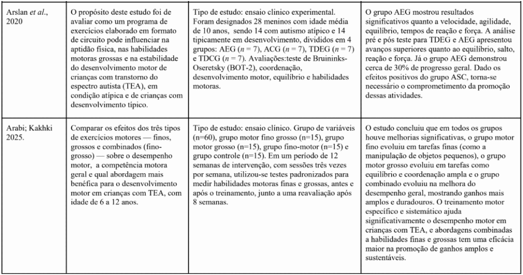MONTEIRO, C. E. et al. The Effect of Physical Activity on Motor Skills of Children with Autism Spectrum Disorder: A Meta-Analysis. Int J Environ Res Public Health., v. 19, n. 21,2022.Disponível em: https://doi.org/10.3390/ijerph192114081.Acesso em: 06 de ago. de 2025.