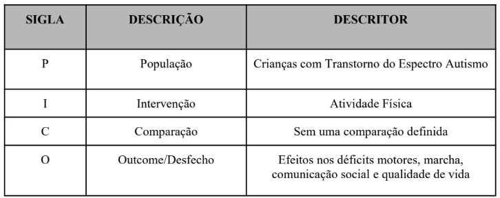Para a elaboração da questão norteadora deste estudo, utilizou-se a estratégia PICO, amplamente empregada em revisões sistemáticas e integrativas por sua capacidade de estruturar o problema de forma clara e objetiva. A sigla representa: P (população), I (intervenção), C (comparação) e O (desfecho). Os elementos específicos do estudo estão detalhados na Tabela 1, contribuindo para garantir a precisão na delimitação do problema e a consistência na condução da pesquisa.