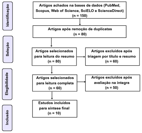 No total, 870 estudos foram identificados nas bases de dados selecionadas. Após a remoção automática e manual de duplicados, 720 registros avançaram para a triagem por título e resumo. Essa etapa permitiu a exclusão de trabalhos que não atendiam à pergunta norteadora, incluindo estudos laboratoriais, pesquisas com populações mistas sem análise isolada da SOP, intervenções desvinculadas do exercício físico e artigos sem os desfechos de interesse, resultando em 150 artigos para leitura na íntegra. A análise completa desses textos aplicou critérios metodológicos mais rigorosos, levando à exclusão de estudos com descrição insuficiente das intervenções, ausência de dados relevantes, incompatibilidade entre objetivos e desfechos ou indisponibilidade de acesso ao texto completo. Após esse processo, apenas 10 estudos atenderam plenamente aos critérios de elegibilidade, constituindo a amostra final da revisão.