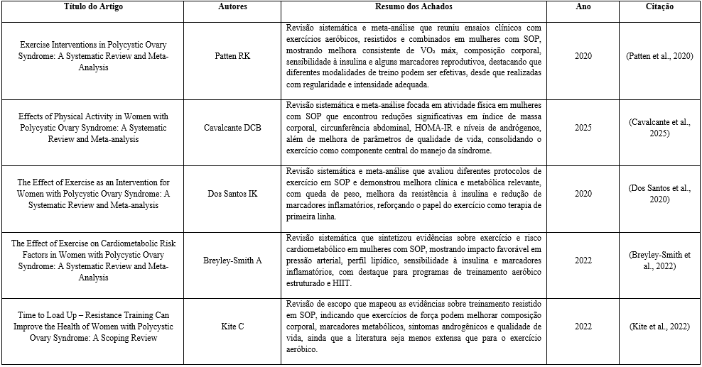 A síntese das dez revisões incluídas demonstra que o exercício físico constitui uma intervenção essencial e amplamente respaldada para o manejo da síndrome dos ovários policísticos. As evidências mostram de forma consistente que diferentes modalidades de exercício aeróbico, resistido, combinado ou intervalado de alta intensidade, promovem melhorias significativas em parâmetros metabólicos, incluindo redução da resistência à insulina, melhora do perfil lipídico e diminuição da circunferência abdominal. Além disso, revisões recentes apontam efeitos favoráveis sobre hiperandrogenismo, regularidade menstrual, inflamação sistêmica e estresse oxidativo, reforçando o papel do exercício na modulação de múltiplos mecanismos fisiopatológicos da SOP.