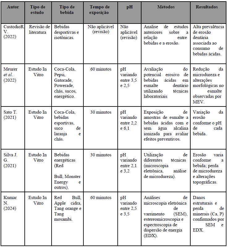 Esses cinco artigos compuseram o corpus analítico da revisão, conforme apresentado no Quadro 1, no qual estão organizadas as principais características metodológicas e os achados de cada pesquisa (autor, tipo de estudo, tipo de bebida, tempo de exposição, pH, métodos e resultados).
