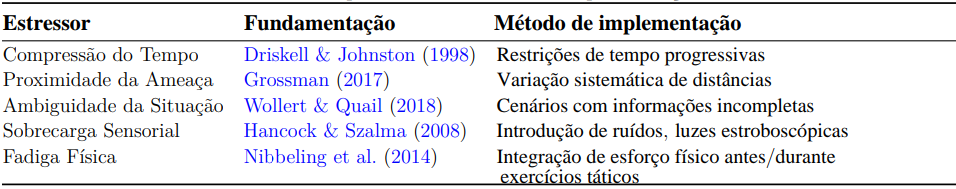 - Ausência de estressores específicos: Andersen & Gustafsberg (2016) identificaram que menos de 30% dos programas de treinamento analisados incorporavam estressores específicos encontrados em confrontos reais, como compressão de tempo, ambiguidade da situação e sobrecarga sensorial.